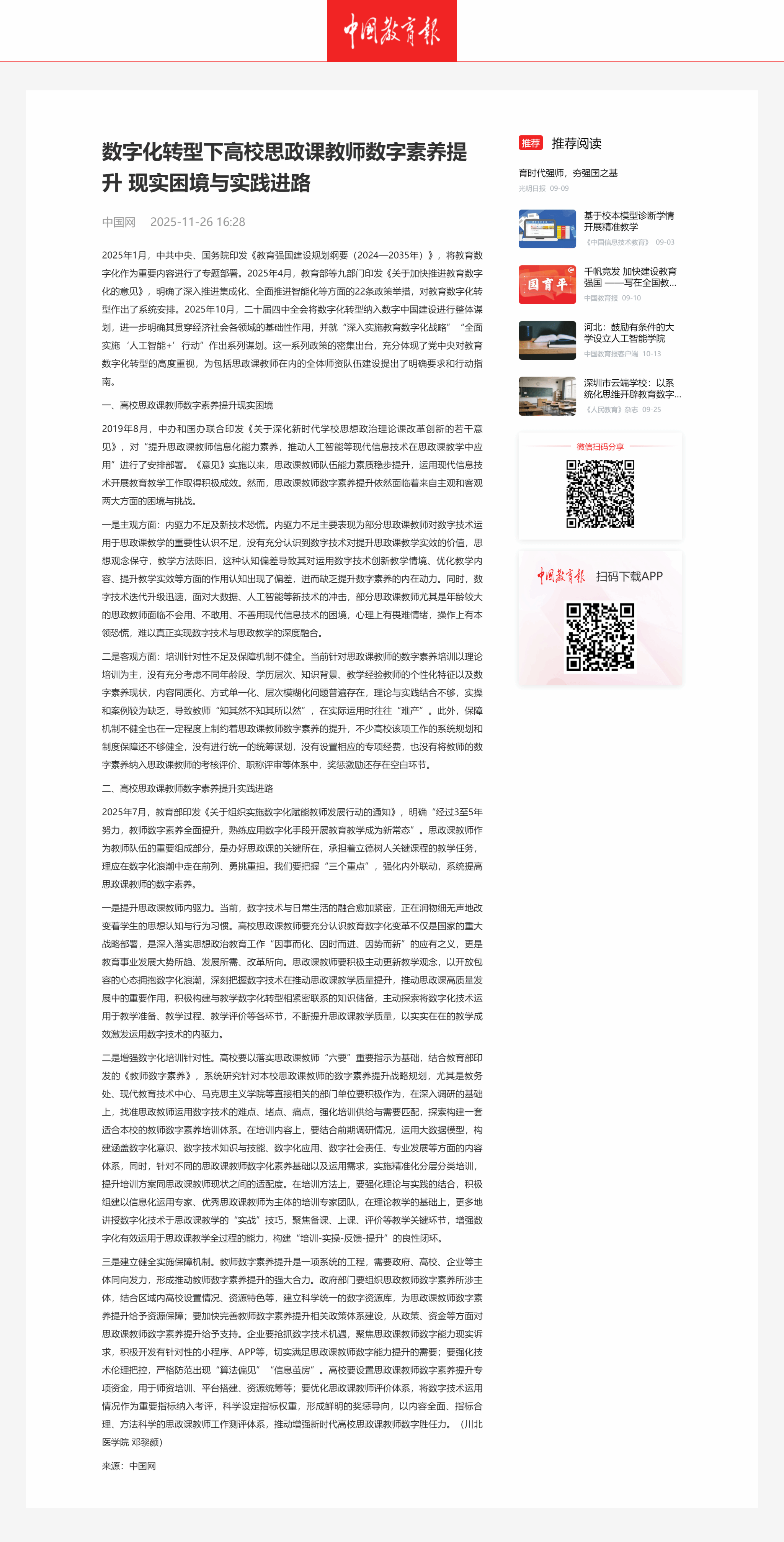 2025年11月26日,我院教师邓黎颜在中国网发表的理论文章《数字化转型下高校思政课教师数字素养提升 现实困境与实践进路》被中国教育报(APP)全文转载。详情如下: