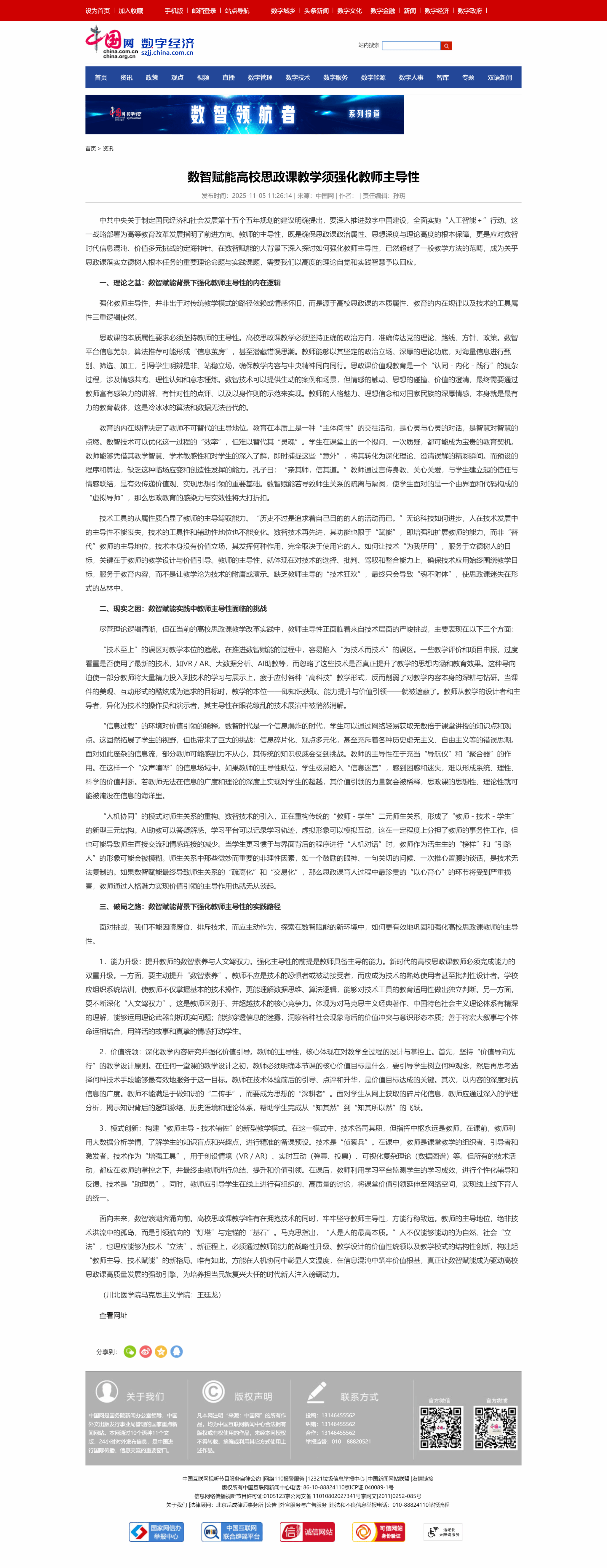 2025年11月5日,我院教师王廷龙在中国网数字经济频道发表理论文章《数智赋能高校思政课教学须强化教师主导性》。详情如下: