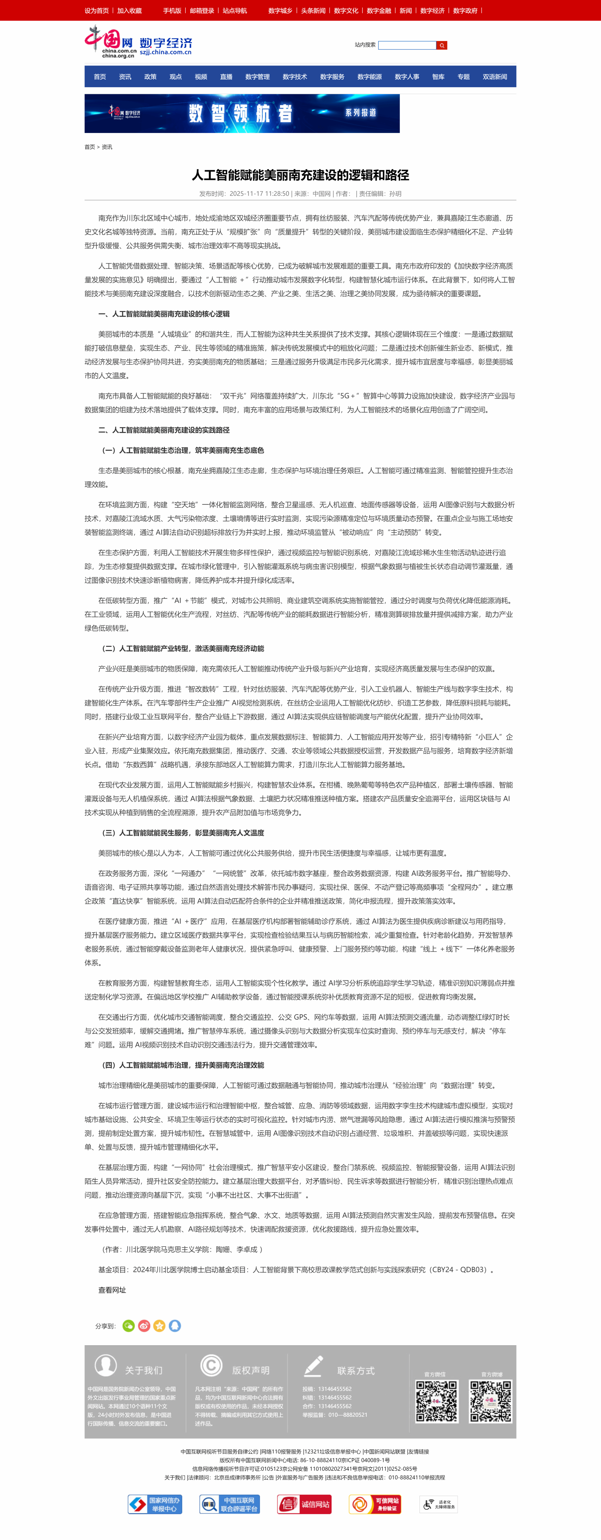 2025年11月17日,我院教师陶姗、李卓成在中国网数字经济频道发表理论文章《人工智能赋能美丽南充建设的逻辑和路径》。详情如下: