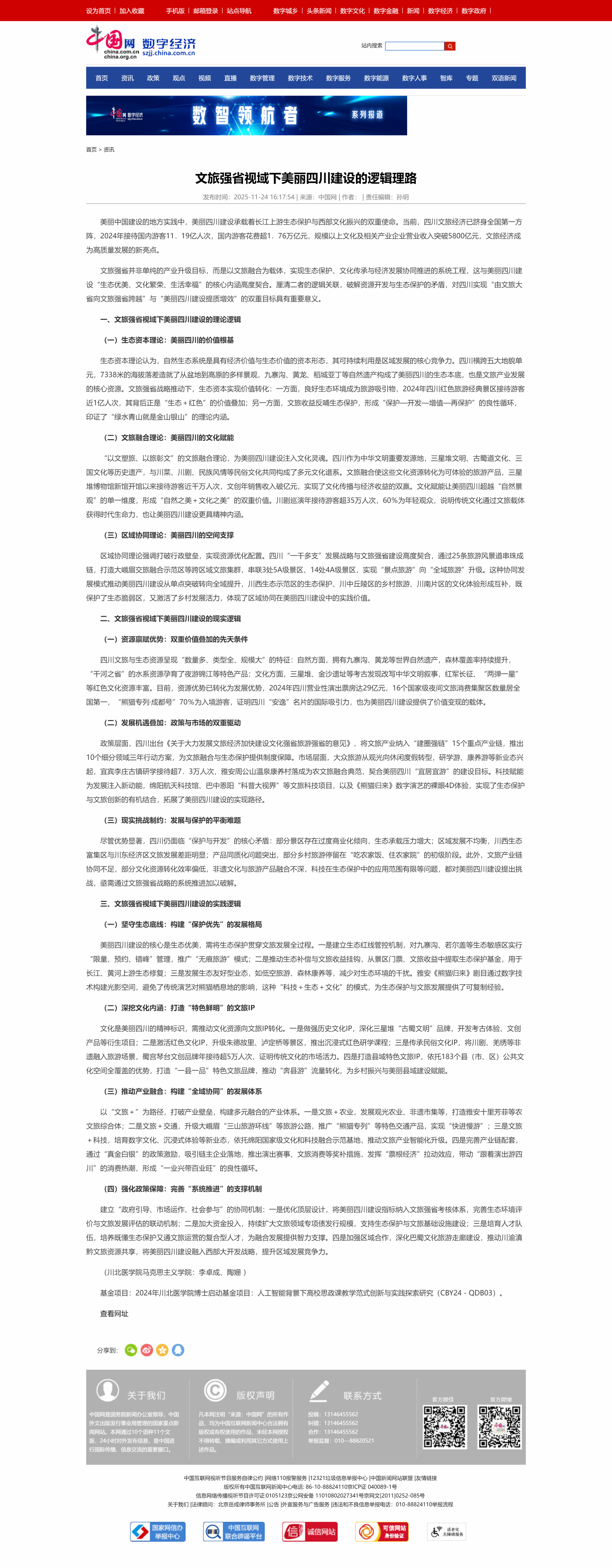 2025年11月24日,我院教师李卓成、陶姗在中国网数字经济频道发表理论文章《文旅强省视域下美丽四川建设的逻辑理路》。详情如下: