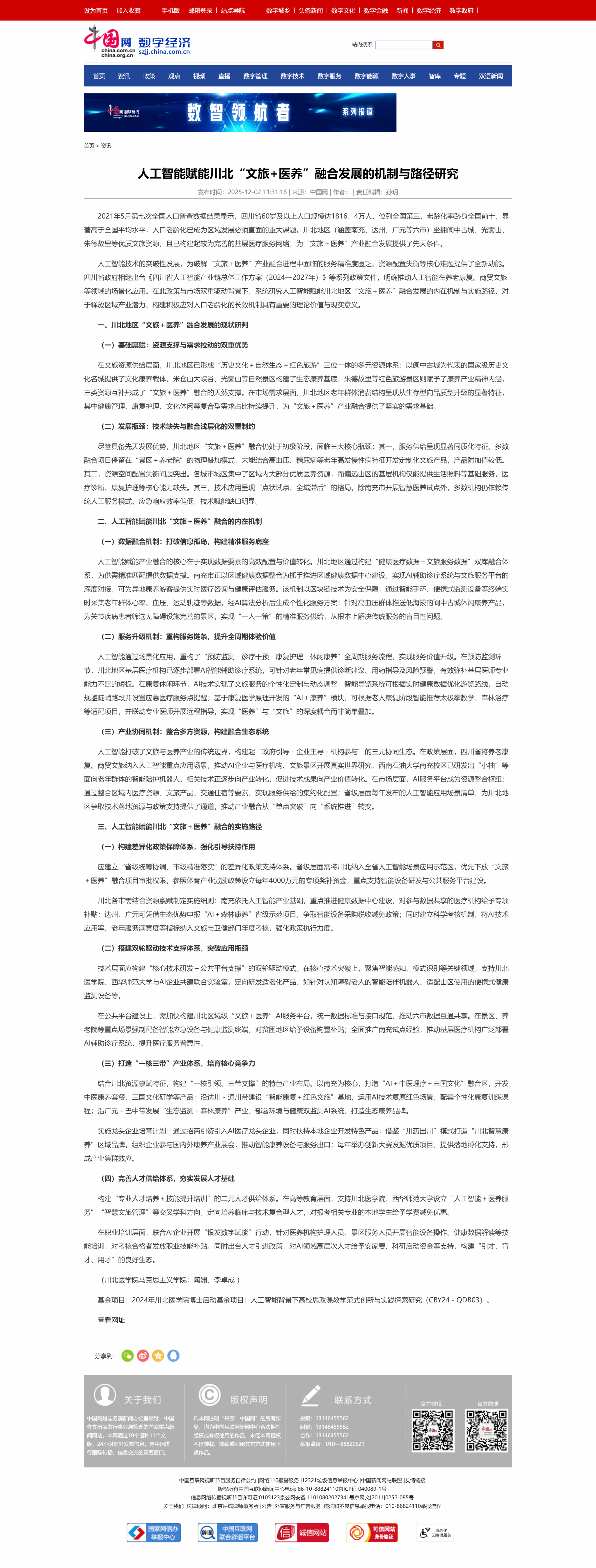2025年12月2日,我院教师陶姗、李卓成在中国网数字经济频道发表理论文章《人工智能赋能川北“文旅+医养”融合发展的机制与路径研究》。详情如下:
