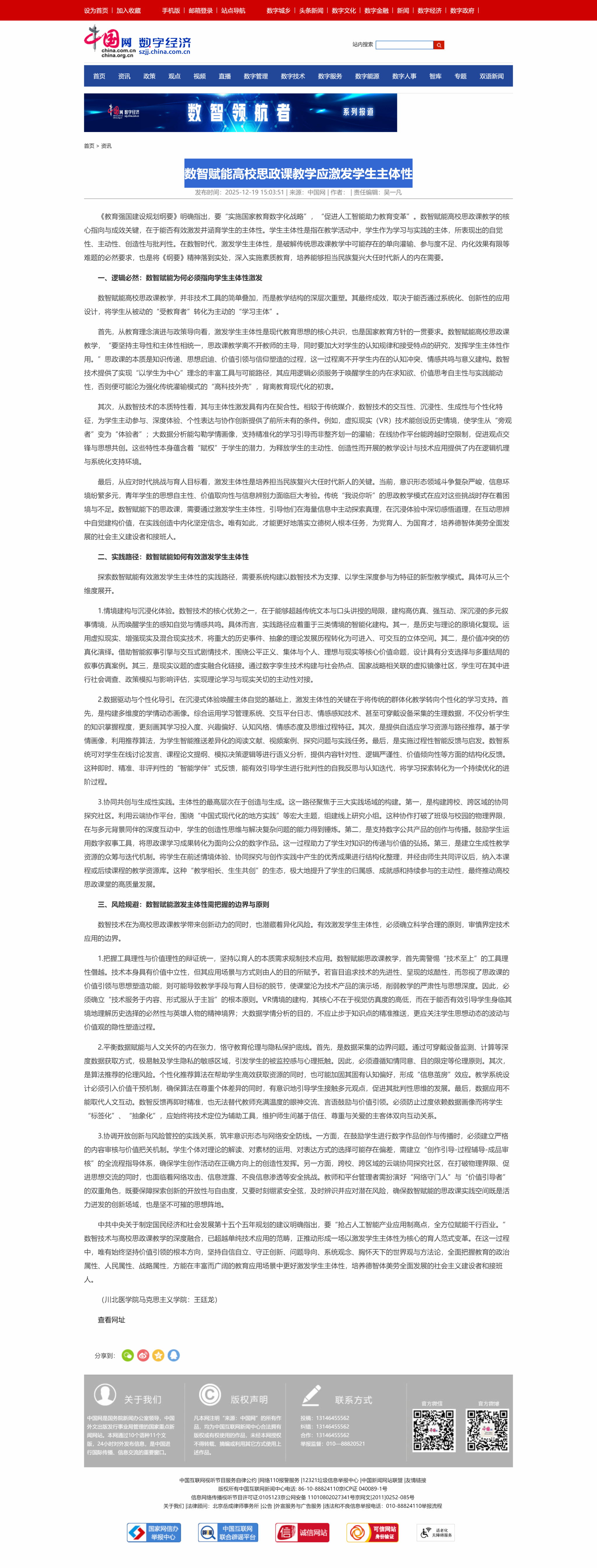 2025年12月19日,我院教师王廷龙副教授在中国网数字经济频道发表理论文章《数智赋能高校思政课教学应激发学生主体性》。详情如下: