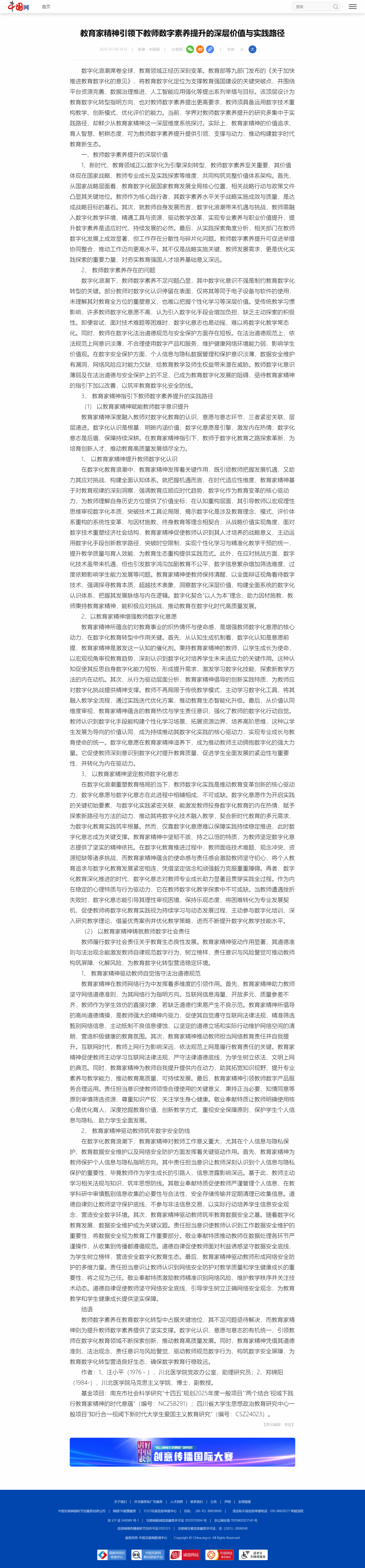2026年1月8日,我院教师汪小平、郑锦阳在中国网发表理论文章《教育家精神引领下教师数字素养提升的深层价值与实践路径》。详情如下: