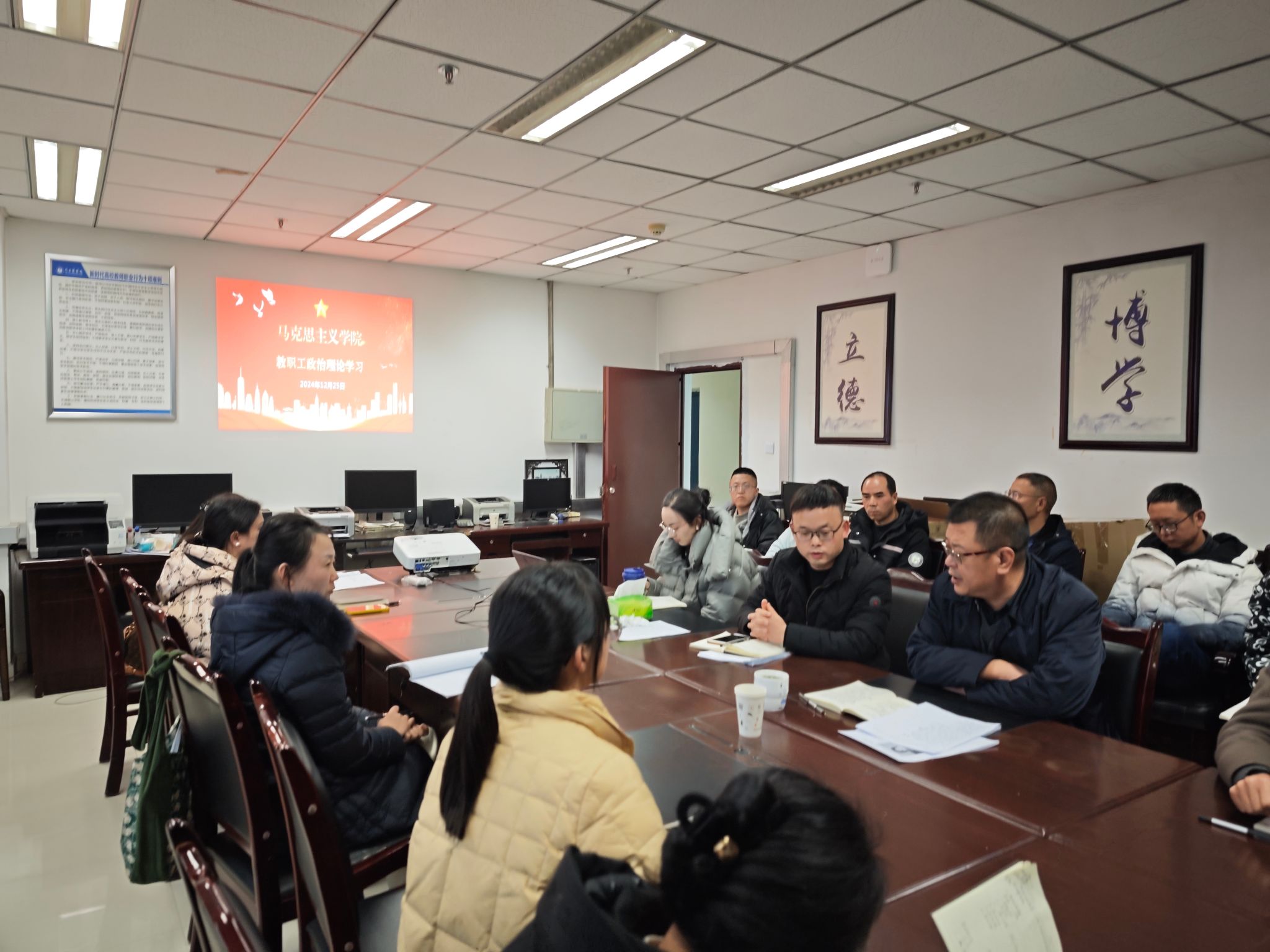 为深入贯彻党中央最新决策部署,进一步加强教师思想政治建设,近日,马克思主义学院于学院会议室组织开展了12月政治理论学习会议。会议由学院党总支书记、院长胡澜主持并领学,学院全体教师参加了此次学习。