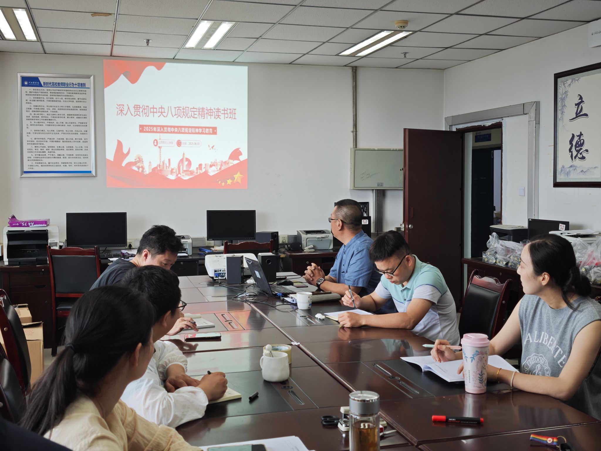 为深入贯彻落实中央八项规定精神,进一步强化作风建设,马克思主义学院于近日组织召开了专题学习教育会议。会议由学院党总支书记、院长胡澜领学,党总支副书记何洋、学院副院长王震、党总支委员及德法教研室、毛概教研室教师代表共同参加学习。