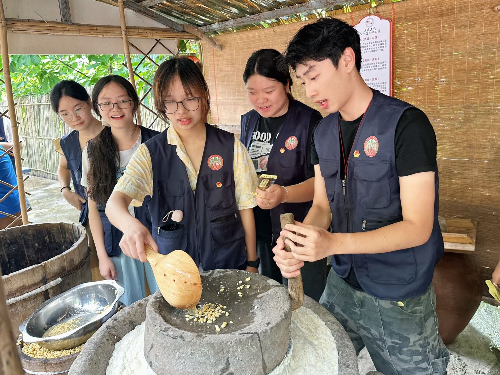 走进周记蔬菜汁豆干研学体验基地,从选豆、备浆、卤煮,到最终收获香甜的豆浆和滑嫩的豆花,实践团成员切身参与了豆花制作的全过程。豆有百味,皆藏自然;磨需千转,始得其香。对当地居民而言,古法豆花制作不仅是一种传统技艺的传承,更是一种生活方式的延续。