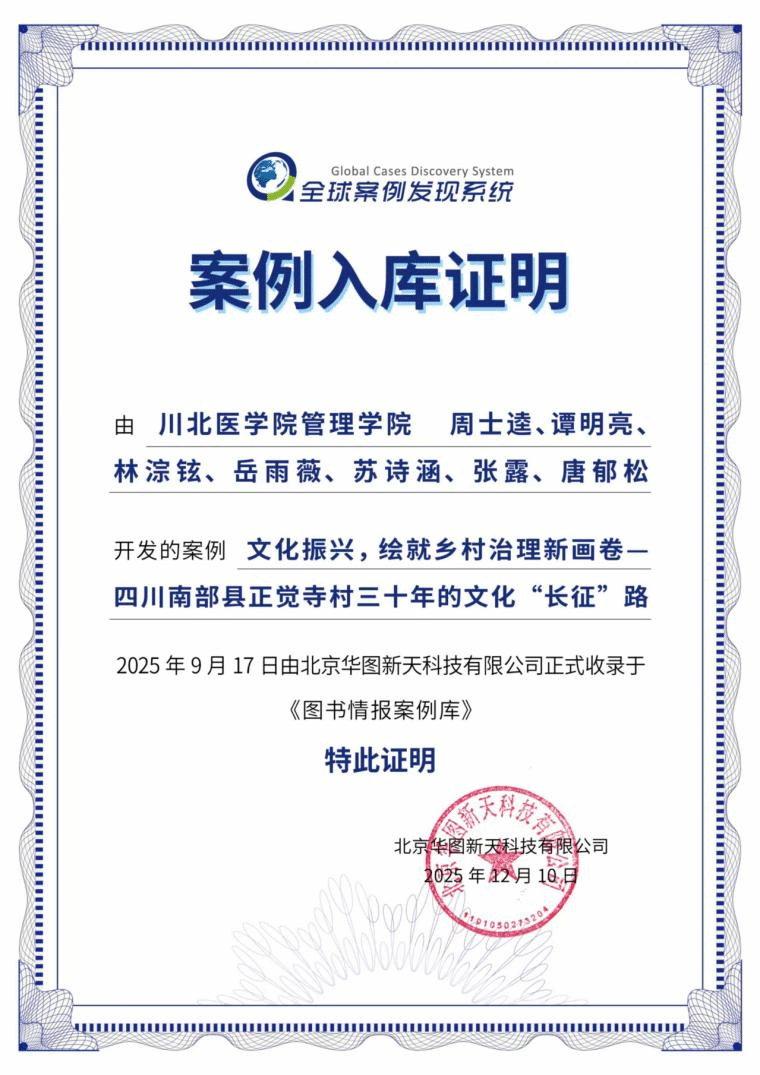 近日,MLIS教育中心教师谭明亮参与编写的案例《文化振兴,绘就乡村治理新画卷——四川南部县正觉寺村三十年的文化“长征”路》成功收录于全球案例发现系统《图书情报案例库》。