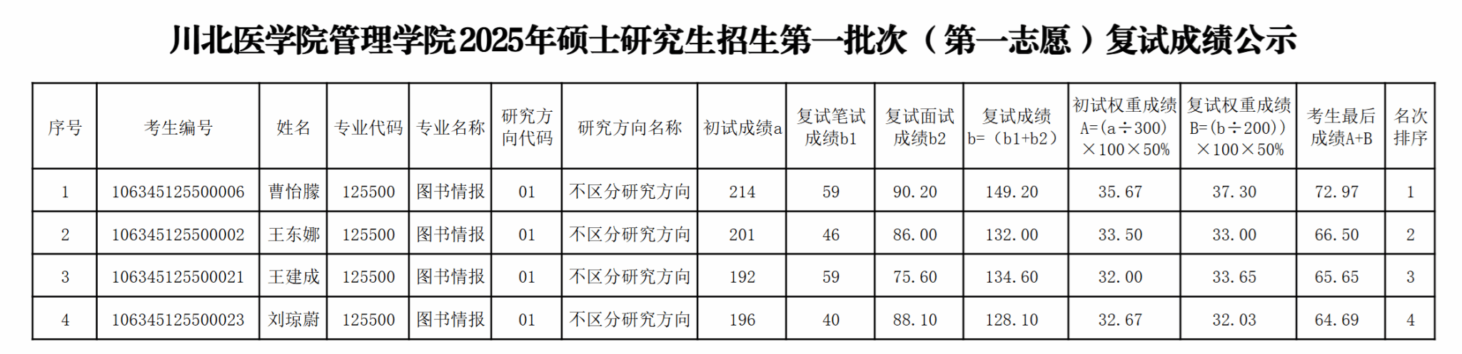 川北医学院2025年图书情报硕士(MLIS)招生(第一志愿)复试成绩现予以公示。若考生对复试成绩有异议,可在24小时内申请复核。联系电话:15984801580(游老师)。