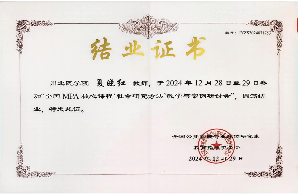 12月28日至29日,由全国MPA教指委主办,哈尔滨工业大学经济与管理学院承办的“全国MPA核心课程‘社会研究方法’教学与案例研讨会”在黑龙江省哈尔滨市顺利举办。来自全国近170家MPA培养单位的240余位MPA教师参加了本次会议。“中心”《社会研究方法》任课教师夏晓红参加了会议,经考核合格,顺利获得了结业证书。