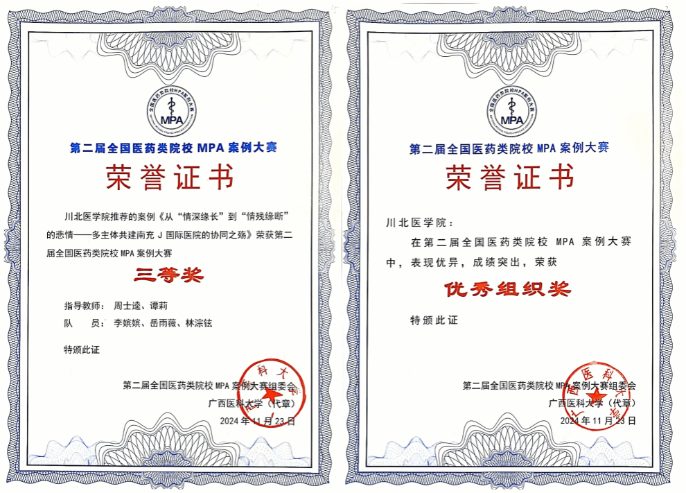近日,第二届全国医药类院校MPA案例大赛决赛在广西医科大学落下帷幕。MPA教育中心案例开发与研究室主任周士逵和专任教师谭莉指导的案例《从“情深缘长”到“情残缘断”的悲情》荣获三等奖,学校获得优秀组织奖。