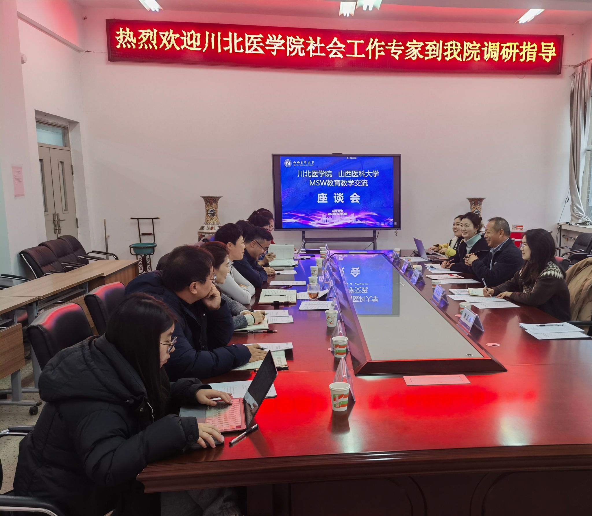 2024年12月12日,川北医学院MPA教育中心副主任张鹏程率领社会工作专业教研室一行,前往山西医科大学人文社会科学学院进行了一场深入的MSW(社会工作硕士)建设与培养交流调研活动。此次调研由学院实验室主任吕佳潞陪同参与。