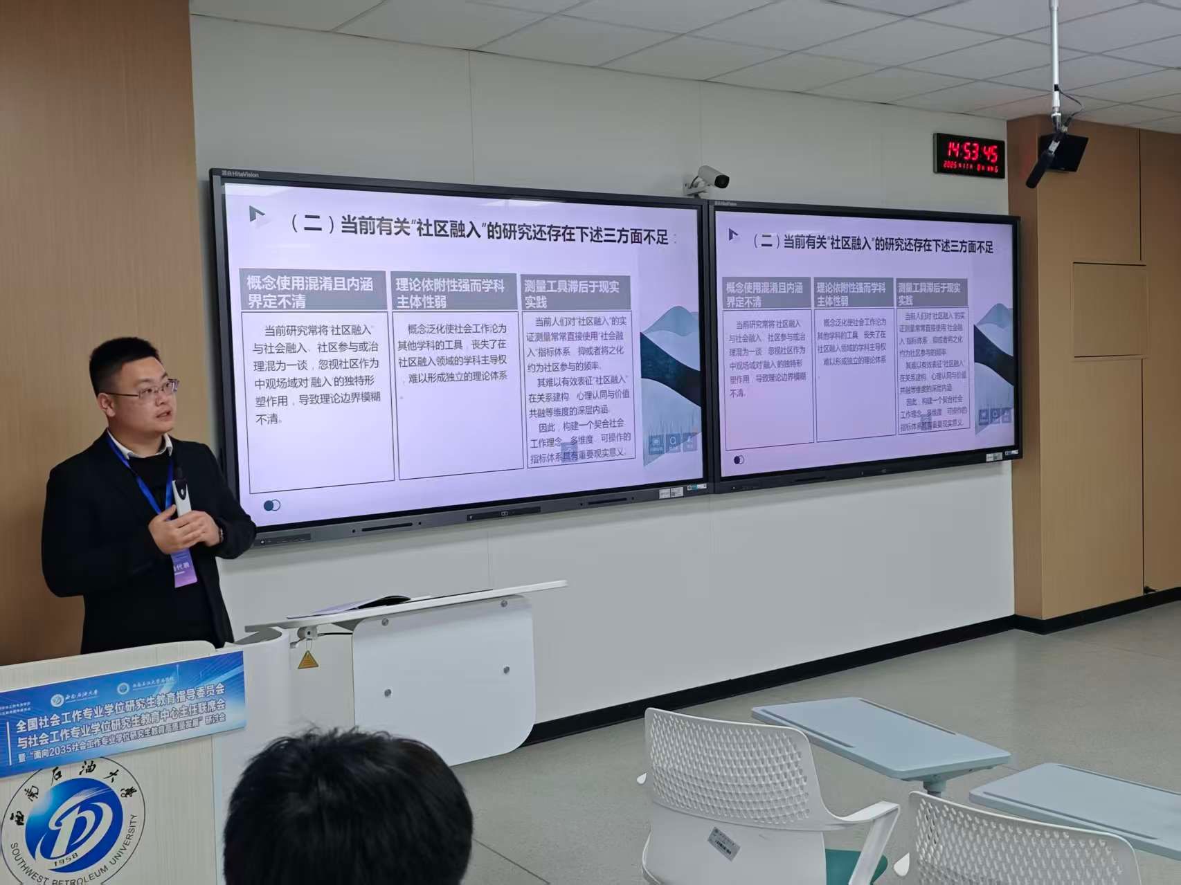 本次会议设6个分论坛,于8日下午在西南石油大学博学楼会议室展开讨论。近百余名与会学者围绕中国式现代化与新时代社会工作高质量发展、社会工作研究生课程思政与产教融合、社会工作中国实践创新与中国自主社会工作理论知识构建、服务治国理政下的社会工作高质量发展、乡村振兴与农村社会工作、数字化时代的社会工作6个专题展开主题汇报。杨宇航代表川北医学院管理学院MSW教育中心在“专业社会工作实务创新与社会治理转型”分论坛作了题为“社区融入:一个社会工作学科的标识性概念”的发言。