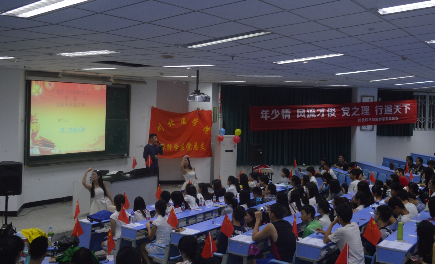 2015年4月26日晚7:00,在西校区102教室顺利举行了以“年少情 风流才俊 党之理 行遍天下”为主题的麻醉学系第一届党知识竞赛决赛。本次活动由川北医学院麻醉学系党总支主办,麻醉学系党总支书记兰海涛,团总支书记薛莲,辅导员杨洋等出席活动并担任评委。本次决赛由熊超超、晏庆主持。
