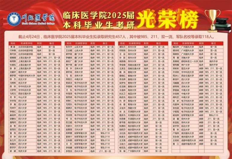 桃李芬芳捷报传,杏林育才硕果香。临床医学院近日喜讯频传,2025届毕业生考研升学率再攀新高:临床医学专业达47.41%,连续三年保持4个百分点的增长态势;麻醉学专业首次突破40%,达41.13%,较去年增长11个百分点;其中,考入北京协和医学院、上海交通大学、四川大学等名校的毕业生118人。这一成绩的取得,是学院近年来构建“招生-培养-就业”的“三链联动”育人体系、实施以“厚度、精度、力度、广度、温度、效度”的“六度聚力”就业策略为抓手的生动实践和集中体现。