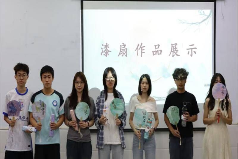 古韵今风,美不胜收。活动主持人周忆深入浅出地向同学们介绍了漆扇的历史渊源、深厚的文化底蕴以及精湛的制作工艺,她从古代文人雅士手中象征风雅的漆扇,到现代艺术领域中漆扇的创新与变革,详细地讲述了漆扇的演变,对关键的工艺步骤,如髹漆、描绘和镶嵌等,也进行了细致的讲解。这种生动的教学方式,使同学们深刻感受到了漆扇所承载的丰富文化和工匠精神的独特魅力。以漆为笔,以水为墨。在活动现场,工作人员准备了制作漆扇所需的材料,包括素白扇面、环保漆、画笔和调色盘等,同学们化身为“绘画达人”,从校园的美景中汲取灵感,投入到漆扇的设计与创作中,将对非物质文化遗产的热爱融入到一笔一画之中。