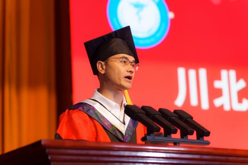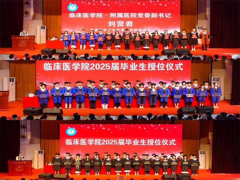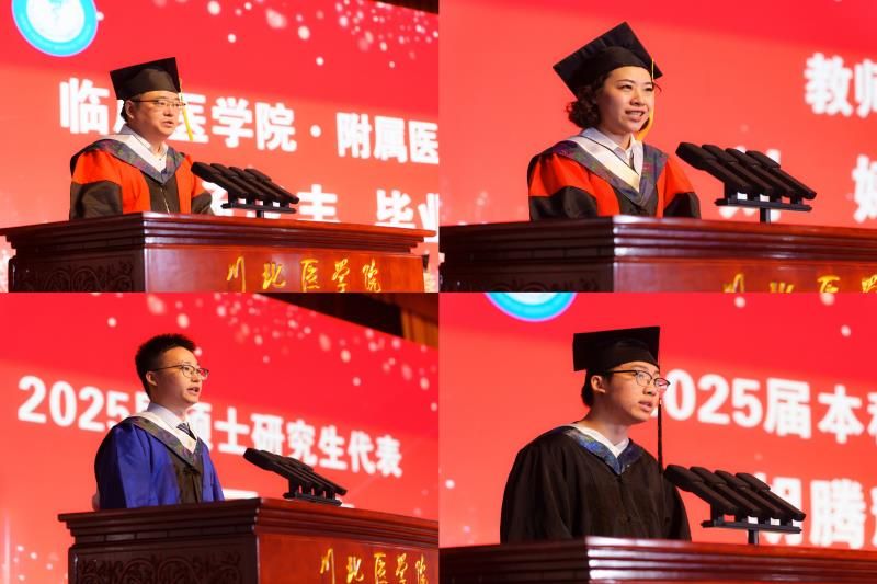 聚是一团火,散做满天星。毕业典礼上,临床医学院·附属医院党委副书记刘贤君为四川省2025届优秀大学毕业生代表颁发荣誉证书。临床医学院·附属医院党委书记杨汉丰寄语同学们:“一要永葆求知之欲,精进医术,终身学习,不断追求;二要恪守仁爱之心,敬畏生命,秉持仁心,精研仁术;三要扎根医学之林,勇担重任,为推进健康中国建设贡献毕生力量。”导师们为120名临床医学和麻醉学本科生代表及30名硕士研究生代表颁发学位证书并拨穗。本科毕业生代表胡腾耀在发言中回顾了自己在川北医学院5年成长历程,表达了对恩师谆谆教诲的感激之情,表示要勇敢地迎接未来挑战,在医学领域发光发热。研究生代表宋可在发言中分享了自己的奋斗青春,结合自己的科研经历,鼓励学弟学妹们勇于探索医学未知领域,为医学事业发展贡献力量。教师代表刘婷在发言中勉励毕业生们:“保持健康、稳定体重,勇敢精进,传递希望,不论起点高低,不论未来如何,努力吸纳正能量,保持自我高能量,赋予他人大能量。”
