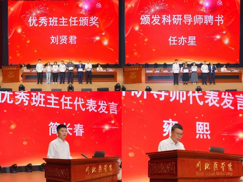 会上,夏都颖先后宣读了《临床医学院关于表彰2024-2025学年度优秀班主任(学业导师)的决定》和《临床医学院·附属医院关于公布2023-2025学年本科生科研导师聘任名单的通知》。刘贤君为优秀班主任颁发荣誉证书,任亦星为新聘科研导师代表颁发聘书。优秀班主任代表简长春分享了班主任工作经历,并承诺将继续秉承着“用心陪伴,用爱引领”的理念做好2025级卓越医师班班主任工作。新聘科研导师代表雍熙则以“一腔热血科研团队” 的实践经历为例,鼓励新生尽早激发科研兴趣,主动参与学术实践,在探索中提升创新能力与科研素养。