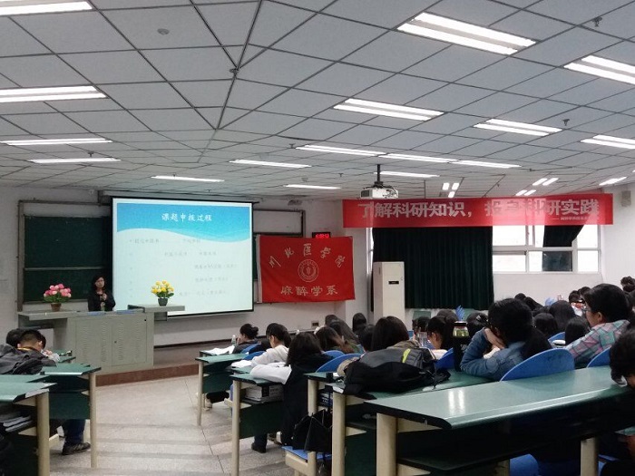 为了向大学生普及科研课题申报的相关知识,激励更多的学生走向科研,11月6日下午,在高坪校区图书信息大楼202教室,我校麻醉学系学生会主办了以“了解科研知识,投身科研实践”为主题答疑讲座。出席本次活动的有麻醉学系科研部部长阮迪姣、在多项社科类课题上取得优异成绩的袁琨、成功申报大学生创新创业项目的罗偲丹。