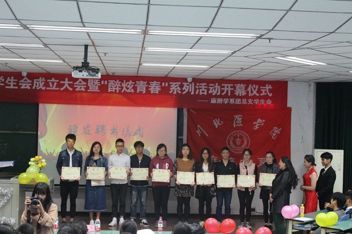 首先,学生会主席熊超超满怀喜悦的对新加入麻醉学系学生会的大一新生表示了祝贺,语中字间透露出的欣慰之情溢于言表。大家都认真的倾听,现场掌声不断,气氛一直十分热烈。其中,熊超超主席的发言引起了在座每一位同学的深思:为什么加入学生会;你想要在这里得到什么;一年后你又将留下什么?一连串的问题虽让同学们应接不暇却也显示出他的急切、他的期望。之后,团支部副书记向全体成员介绍了此次“醉炫青春”系列活动的主要内容,并对全体成员提出了殷切的期望和要求。然后,全体成员庄严的起立宣誓,并紧握右拳:“我宣誓……”每一句的誓词,都铿锵有力,饱含热情,展现了整个麻醉学系学生会成员会用行动去诠释“提升自我,服务大家”的真切内涵。其后,嘉宾向主席团颁发聘书,合影留念,并由薛莲老师宣布“醉炫青春”系列活动正式开幕。最后,学生会各部门部长先后对部门职能做了介绍,也勾勒了各自心中的美好蓝图,在全体成员的期望和掌声中,此次麻醉学系学生会成立大会暨“醉炫青春”系列活动开幕仪式圆满结束。