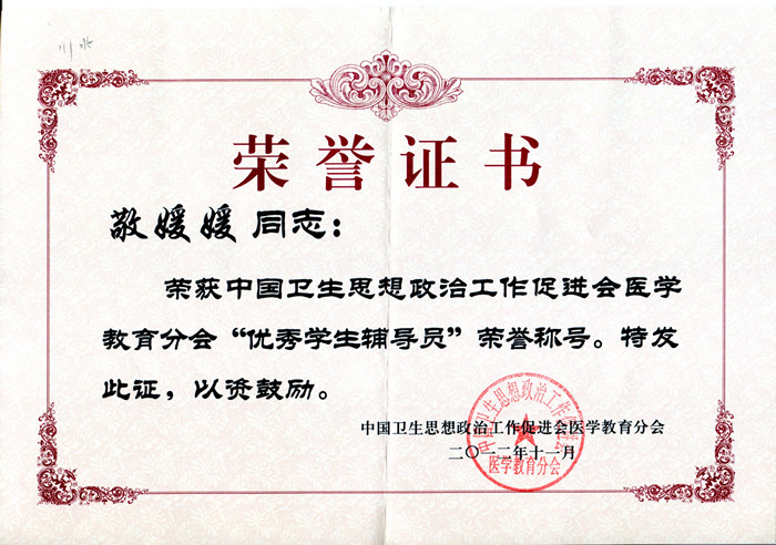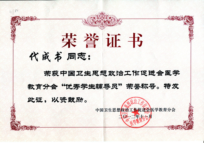 日前,中国卫生思想政治工作促进会医学教育分会年会在广州召开。大会表彰了全国20家2012年卫生文化建设先进单位、39位优秀学生辅导员。我校临床医学系被授予“卫生文化建设先进单位”,我校教师代成书、敬媛媛分别荣获“优秀学生辅导员”称号。