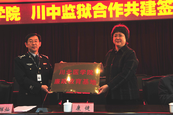 警示教育会上,川中监狱党委书记、监狱长黄辉灿向我校一行介绍了监狱基本情况。川中监狱与我校签订了《川北医学院、川中监狱合作共建协议》;我校向川中监狱授予“川北医学院廉政教育基地”牌匾。两名川中监狱服刑人员现身说法,讲述了走上犯罪道路的原因,总结了教训,用自己亲身经历的痛苦和悔恨,给与会人员上了一堂直观、生动、形象的警示课。
