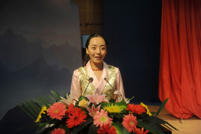 学生代表彭毛措同学献上洁白的哈达,祝福全体教师们节日快乐,她在发言中感谢老师们培养,祝愿老师们身体健康,祝愿学校教育教学事业取得更大成绩。
