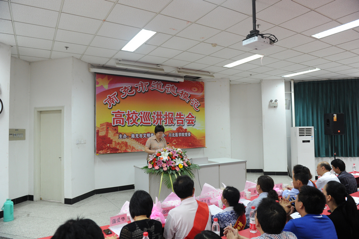 康健在致辞中代表学校党委、行政向各位道德模范致以崇高的敬意。她指出,举办道德模范事迹报告会,是引领社会风尚的神圣使命,是激励人性光辉、凝聚发展动力的重要渠道。近年来,南充市相继涌现出文建明等一批全国、全省、全市先进模范人物,他们的崇高精神可以引导大学生见贤思齐、自我提升,让更多的师生群众受到教育、获得力量,必将在全校、全社会树立崇德向善的高尚旗帜,凝聚建设道德高地和精神家园的强大合力,也更能够激励广大师生积极投身道德实践,不断推动学校思想道德建设在高起点上实现新的突破。希望全校师生在感动的基础上付诸实践,努力学习道德模范助人为乐、敬业奉献、诚实守信、孝老爱亲等高尚品质,从他们亲力亲为的先进事迹中有所收获、有所感悟、有所启发,将精神力量转化为工作、学习和生活中的动力,使我们自身的思想道德和精神品质不断得到修正和完善。她号召全校师生向道德模范致敬,弘扬道德文化,培育文明风尚,更加自觉深入地开展学习宣传道德模范活动,让文明的新风吹拂校园每个角落,以良好的道德风貌迎接党的十八大胜利召开。