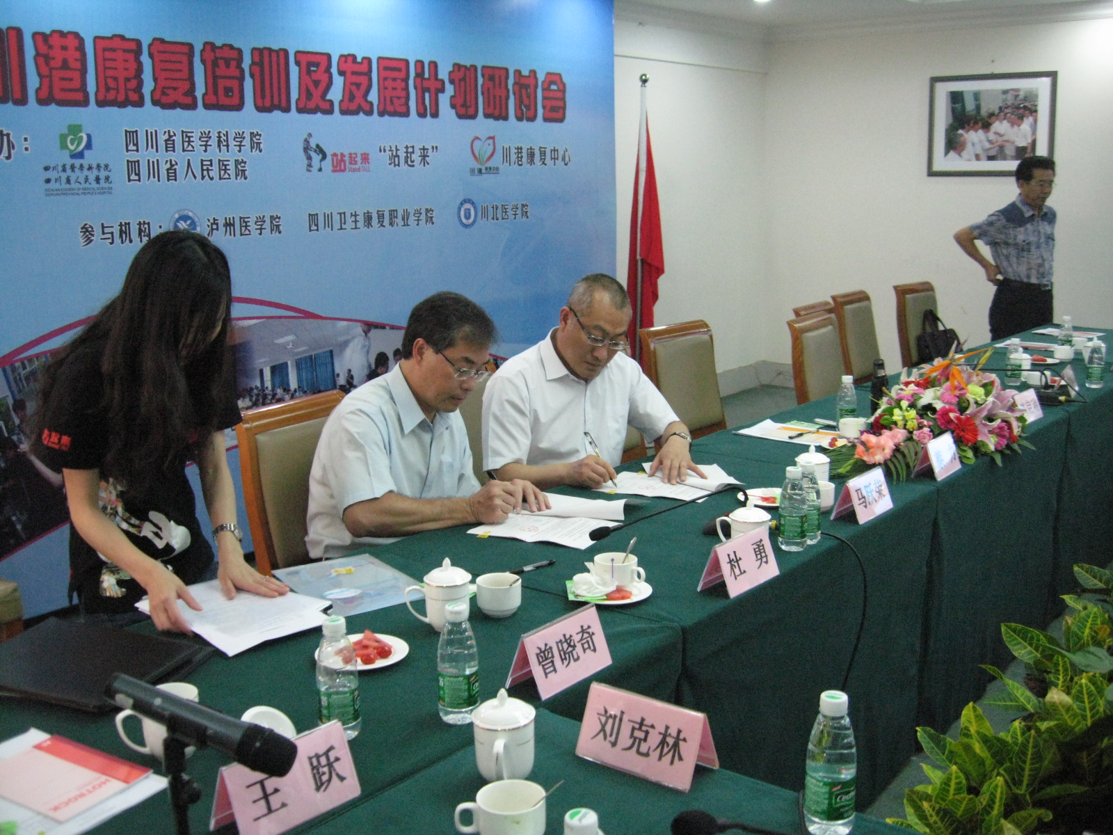 会上,香港“站起来”组织与四川省人民医院、泸州医学院、四川卫生康复职业学院及我校就过去两年的培训成效、改善空间以及2013-2018年的康复培训发展方向作了研讨。研讨结束后,杜勇和 “站起来”组织负责人香港中文大学陈启明教授签署了康复仪器及图书捐赠协议。