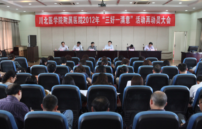 为贯彻落实中央以人为本、执政为民的要求,推动深化医改工作顺利进行,加强卫生行业作风建设,丰富“创先争优”活动实践载体,5月3日下午,我校附属医院在附属医院影像楼六楼会议厅召开2012年“三好一满意”活动再动员大会,贯彻落实卫生部和省卫生厅开展2012年“三好一满意”活动内容精神,安排部署医院2012年“三好一满意”活动具体工作。