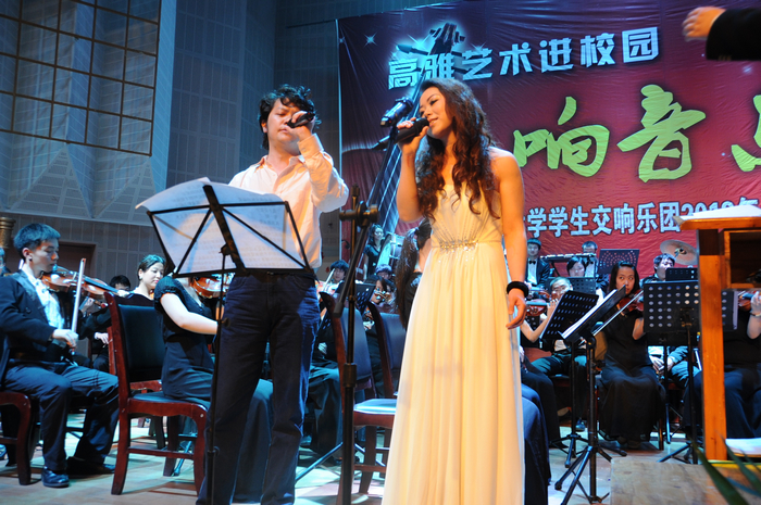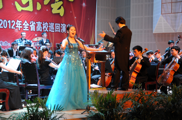 随后,交响音乐会以一首爽朗轻快的《地狱中的奥菲欧》序曲拉开帷幕,小提琴独奏《化蝶》、《铁匠波尔卡》、钢琴独奏《梦中的婚礼》、《水边的阿丽蒂娜》等经典曲目一一为观众呈现,优美的旋律,精彩的演奏让观众沉浸在音乐的世界中。伴随着荧幕上电影《神话》片段的播出,我校夏榕老师和冯马飞老师与交响乐团共同演绎了一段凄美缠绵的爱情故事,赢得了现场观众的阵阵掌声。精湛的技艺,完美的配合,感情的抒发,使得整场交响音乐会精彩不断。演出在管弦乐《茉莉花》优美的旋律中结束。