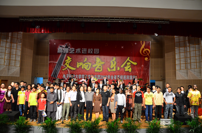 演出结束后,我校学生代表向电子科技大学学生交响乐团敬送鲜花。出席活动的部分领导、师生代表与演职人员合影留念。