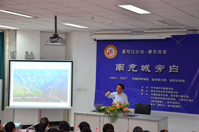 4月28日下午,在我校顺庆校区一教楼101教室,由南充市委宣传部主办,南充市社会科学界联合会承办,我校宣传统战部等单位协办的“嘉陵江论坛 周末课堂”报告会在此隆重举行。中国侨联常委、四川省侨联主席、四川省政协常委、我校原党委书记冯文广教授做客“嘉陵江论坛 周末课堂”,为广大市民朋友及在校学子带来了一场题为 《南充城旁白》的精彩讲座。