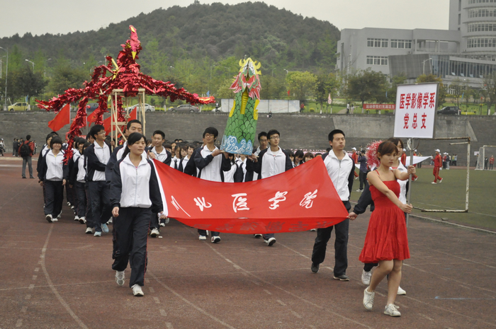 伴随着嘹亮的口号--“影像健儿,驰骋赛场,龙飞凤舞,再创辉煌”, 高举龙凤模型的医学影像学系方队迈进赛场。这支队伍由200人组成,影像学子亲手制作的龙凤模型,体现了他们创新的精神。凤凰振翅,散发鳞鳞红光,蛟龙浅翔,彰显不屈意志。