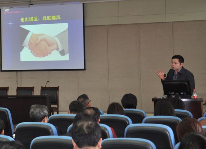 活动中,学院副院长、附属医院院长、附属医院风湿血液内科专家周京国教授做了题为《疑难痛风病诊治中的有关问题》的学术讲座。周京国结合自己多年的科研与临床经验,详细讲解了痛风的流行病学、痛风的发病机制、痛风的临床研究、药物的临床选择及应用原则、原发性痛风与继发性痛风的鉴别诊断等热点问题,并结合临床病例,与参会医护人员和患者及家属重点探讨交流了疑难痛风病的诊断、治疗药物选择及注意事项。青岛大学医学院附属医院李长贵教授和内分泌与代谢病专业医师韩琳分别做了题为《痛风病的认识误区及对策》、《饮食与痛风》的讲座。主讲专家与在场医师们、患者进行了面对面的义诊宣教交流,对患者提出的问题进行了详细解答。