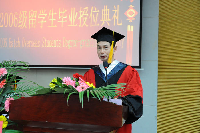 教师代表杨小霖博士带领2006级毕业留学生宣读了医学生誓言。Amit作为外籍教师发言。留学生代表Venu在发言中表达了对学校的留恋与不舍之情。在校生代表Ham对毕业留学生送上了美好的祝愿。