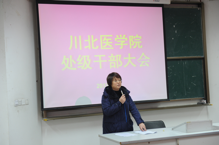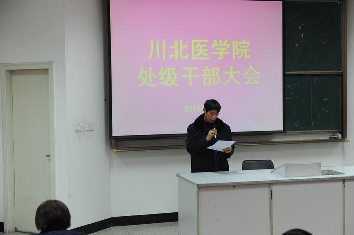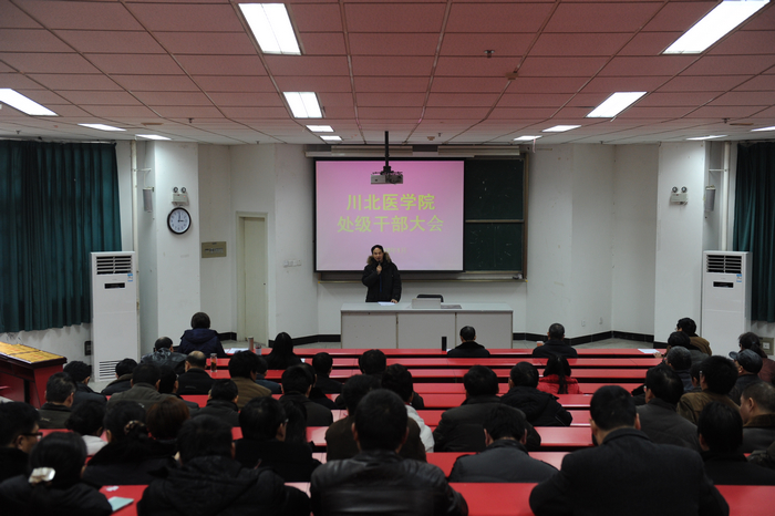 1月12日下午,学校在顺庆校区101教室召开了处级干部大会,总结2011年工作、安排寒假和2012年工作。会议由党委副书记李成军主持。全校处级以上干部参加了会议。