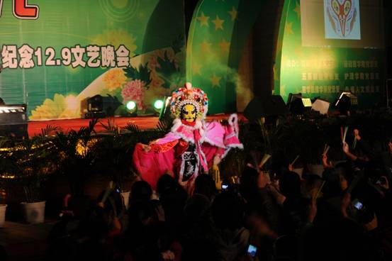 晚会在12·9历史事件视频播放和欢快的快板舞《走向辉煌》拉开序幕。气势雄浑的女兵舞《巾帼勇锋》、刚柔并济的杂技表演《力量》和川剧绝活表演轰动全场;环保时装秀和武术表演展现出我校学子非凡的创造力;现代舞《毕业照》将难以割舍的同窗情展露无遗;动感十足的《歌舞组合》和舞蹈《骤雨新荷》以别出心裁的编排与高超的表演将晚会的气氛推向了高潮。伴着诗朗诵《青春年代》晚会圆满落幕。
