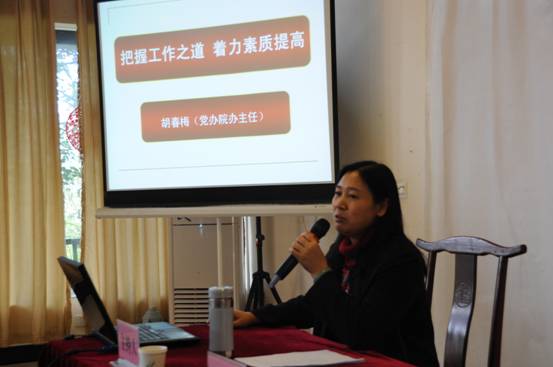 随后,党委、行政办公室主任胡春梅作了题为“把握工作之道 着力素质提高”的专题讲座,她就办公室工作的职能、特点和规律等内容,以图文并茂的形式生动进行了讲解。此外,会上还就公文与新闻写作等内容进行了培训。