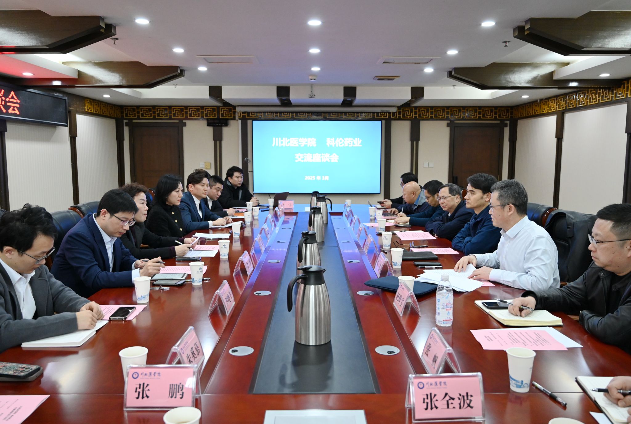 科伦药业药物研究院、人力资源部等部门负责人和技术专家,学校科技处、校地合作处、药学院、附属医院及相关科研平台负责人参加会议。