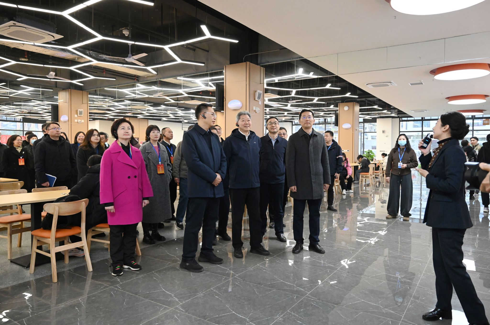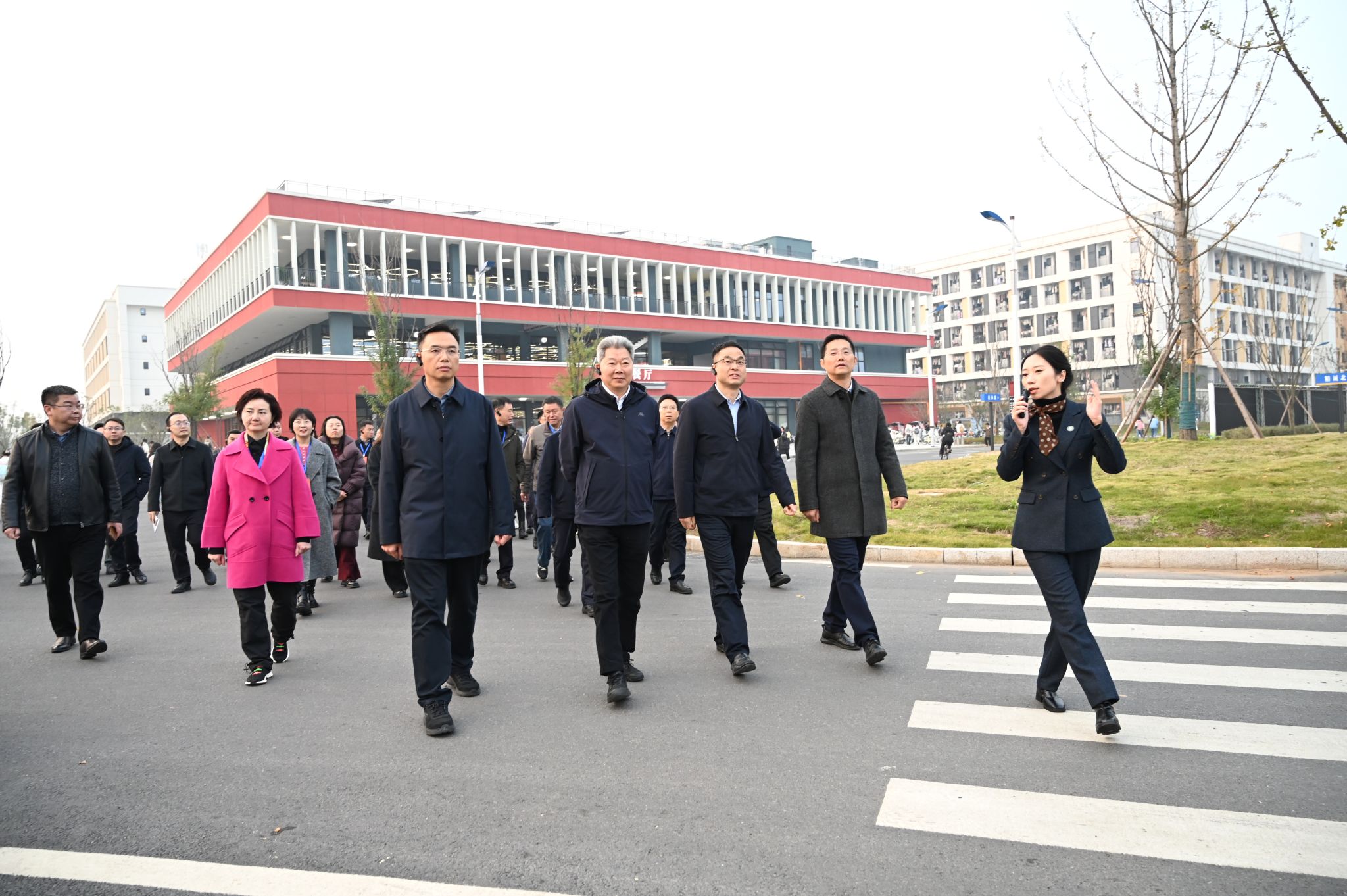 代表团一行先后实地视察了临江校区学生食堂、智慧教室、图情信息中心,认真听取了相关情况介绍,详细了解校区整体规划、功能布局及建设进展。