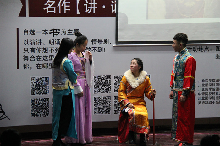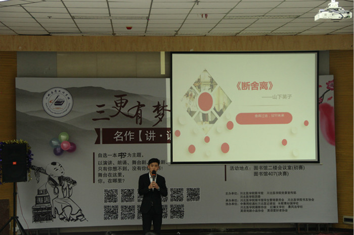 11月27日晚,由学校图书馆、党委宣传部、团委主办,图书馆学生管理委员会和书友协会承办,由中青网校通社川北医学院记者站、长歌青衫国学社、摄影协会、红壤文学社、晨风法学社、英语戏剧小品协会、英语爱好者协会等协办的“三更有梦书当枕”经典名作讲·诵·演比赛,在高坪校区图书信息大楼407教室拉开决赛序幕。学校图书馆、党委宣传部、团委等部门领导和老师观看了比赛。