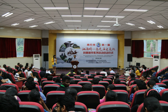 近日,由南充市社会科学界联合会、四川省川北历史文化普及基地主办,我校国际教育交流学院、西华师范大学国际教育学院、西华师范大学文学院、西华师范大学图书馆、南充市科学文化普及协会承办的南充市第一届“汉语桥--南充历史文化”科普系列活动启动仪式在我校高坪校区图书信息大楼407教室隆重举行。中共南充市市委宣传部常务副部长赵东,南充市社科联科普部部长贾英,四川省川北历史文化普及基地主任、西华师范大学图书馆副馆长吴晓川,四川省川北历史文化普及基地副主任、西华师范大学国学院副院长杨小平,我校国际教育交流学院副院长严宏伟及两高校部分老师、中外学生200余人参加了本次活动。活动开始前,两校学生志愿者与各国留学生进行了交流。