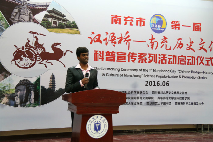 在“汉语桥”活动启动仪式上,杨小平教授对本次活动进行了介绍,他指出,此次“汉语桥”活动是为南充和世界架设友谊的桥梁,为国际文化的交流提供平台。我校留学生Harry代表在南充学习的留学生发言,他从个人经历讲述了在南充的学习与生活,以及对“汉语桥”传播中国文化的兴趣和期待。Harry的精彩演说赢得了在场观众的阵阵掌声。最后,赵东为活动致辞,他说,我国目前与友好国家的“一带一路”建设,离不开文化交流,文化是“民心工程、未来工程”,是维系国与国之间友好往来的纽带,“汉语桥”活动是为留学生们搭建认识南充历史文化的平台,希望留学生们能够成为传播中国文化的友好使者,最后,他祝愿此次活动圆满成功并宣布活动正式启动。