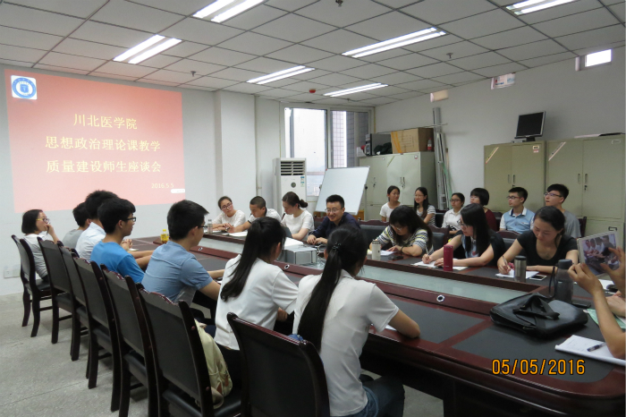 为充分发挥思想政治理论课对大学生进行思想政治理论教育的主阵地、主渠道作用,进一步提升思想政治理论课课堂教学质量和教学实效性,5月5日晚思政部主要负责人和各教研室主任与来自2012级、2013级、2014级覆盖全校各个专业30余名学生代表在图书信息楼八楼会议室举行了思想政治理论课教学质量建设师生座谈会。