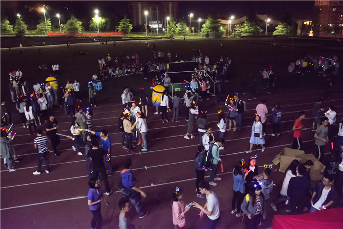 晚上8时,同学们纷纷手拿荧光棒、粘贴荧光名牌,开始沿着我校运动场、风雨操场和图书信息大楼奔跑,黑夜中荧光闪闪,点缀着校园环境,成为一道亮丽的风景线。夜跑结束后,同学们还开展了“撕名牌”活动,现场气氛活跃热烈。