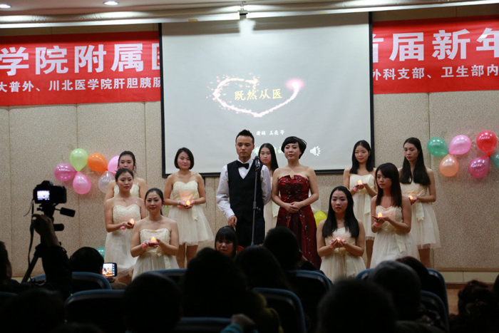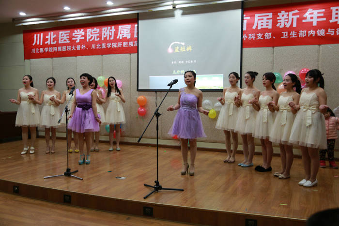我校副院长、附属医院党委书记张小明教授在晚会上致辞,代表医院党政给普外科全体医护人员拜年,并对普外科过去一年来取得的成绩给予充分肯定,希望2016年取得更大的成绩。普外科主任李敬东教授发表讲话,代表普外科向全科职工、家属及离退休老同志致以新年的祝福和诚挚的问候。肝胆胰肠疾病研究所是一个年轻、蓬勃向上的科技创新团队,他们始终以创建省高校重点实验室为目标,由他们带来的合唱《爱因为在心中》为整台晚会拉开序幕。各科室精心编排了合唱、歌舞、配乐诗朗诵、小品、互动游戏“蒙眼缝合打结”等18个节目。精彩的歌舞表演充分展现了普外科医护人员积极向上的心态和团结协作的精神,表达了热爱党、热爱祖国、热爱医院的满腔热情和奋发进取、团结一心的精神风貌。整台晚会在普外科大合唱《相亲相爱的一家人》欢乐祥和的气氛中落下了帷幕。