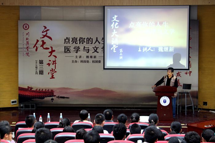 为培养属于医学生独有的人文精神,点亮精彩人生,10月22日晚,由科技处和校团委主办,校学生会文化交流部承办的“点亮你的人生,医学与文化”主题讲座于高坪校区图书信息大楼407室举行。知名作家魏继新先生与我们相约探讨文学之路,科技处、校团委老师及300余名学生聆听了讲座。