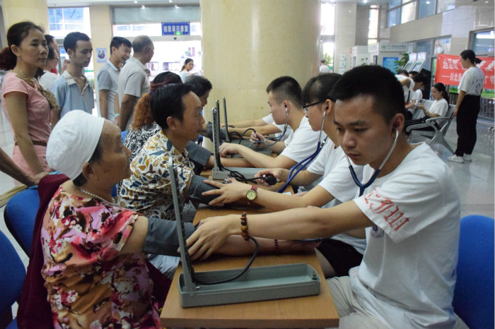义诊活动分为血压测量、现场健康咨询、健康知识单派发三个部分。上午8:30,内科大楼的大厅已聚集不少前来咨询的群众,让原本宽敞的大厅略显拥挤。群众或拿病例单询问,或健康咨询,或直接看病,在场专家们一一耐心解惑,他们精湛的医技、崇高的医德得到了群众的一致称赞。“听说这里可以免费测血压、看病,我衣服还没有洗完就过来了,还好赶上了。”一位50岁的妇女对记者说到。专家义诊的同时,三下乡的队员们并没有停下来,一只手执着气囊,两只耳朵挂着听诊器,四目平对血压计,队员把他们在校所学的理论知识,充分运用到实践中。