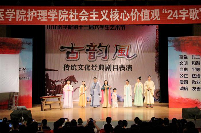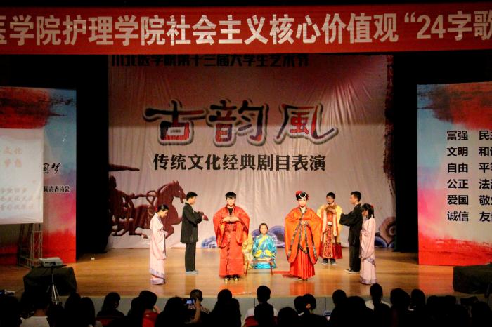 本次活动分为“默诗成化”和“古韵风”两个环节。在“默诗成化”环节中,八组选手旗鼓相当、大显身手,《离骚》、《诗经》等脍炙人口的诗篇在选手们的笔尖中绽放,充分展示了川北医学子的文化底蕴和扎实的文字功底,赢得场下无数掌声。在激烈的角逐中,第三组荣获桂冠。“古韵风”环节,一出出精彩的古装剧在台上被演绎,特别值得一提的是唐代古装表演《一梦睢阳》采用倒叙的手法,将“安史之乱”中战争背景下爱情的唯美表现得淋漓尽至;《金玉良缘》则是完整地将中国古代的婚礼场景呈现于舞台之上,赢得了观众们的一致好评。《倾城》、《凤求凰》、《霸王别姬》等经典剧目也轮番上映。最终,本次活动在一段介绍中国传统“汉服”文化的视频中落下帷幕。