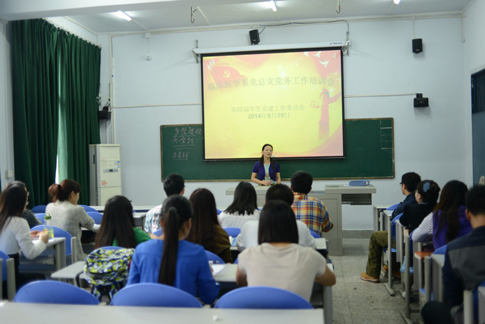 培训会上,系总支书记何昆蓉就《临床医学系党总支关于2014-2015学年第一学期党组织生活安排的通知》《临床医学系党总支2014年下半年“主题党日”活动立项实施意见》作了说明,并作了“高校学生主题党日活动探讨”的主题培训。